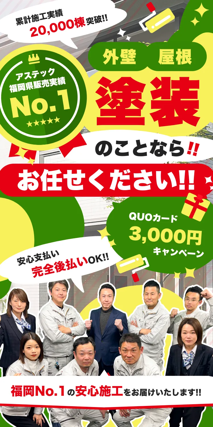 ユーペイントは福岡県で20,000件以上の圧倒的な施工実績数を誇っており、材料の仕入れ価格を同業他社よりも大幅に抑えることができます。それゆえ、原価率を下げても品質は変わらず、低価格で高品質な施工を実現しています。これもひとえに弊社へご依頼いただく地域の皆様あってこそであり、お客様への還元を惜しみません。