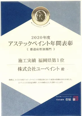 弊社は実績と信頼があり、次世代の高性能塗料を生み出し続ける塗料メーカーである「アステックペイント」の塗料を取り扱い、施工数を積み重ねてきました。結果、アステックペイントの年間表彰にて都道府県部門の福岡県施工実績No.1を獲得することができました。
