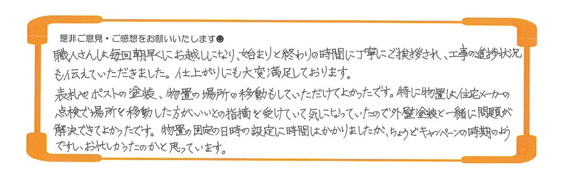 表札やポストの塗装、物置の場所の移動もしていただけてよかったです。特に物置は住宅メーカーの点検で場所を移動した方がいいとの指摘を受けていて気になっていたので外壁塗装と一緒に問題が解決できてよかったです。物置の固定の日時の設定に時間はかかりましたが、ちょうどキャンペーンの時期のようですし、お忙しかったのかと思っています。