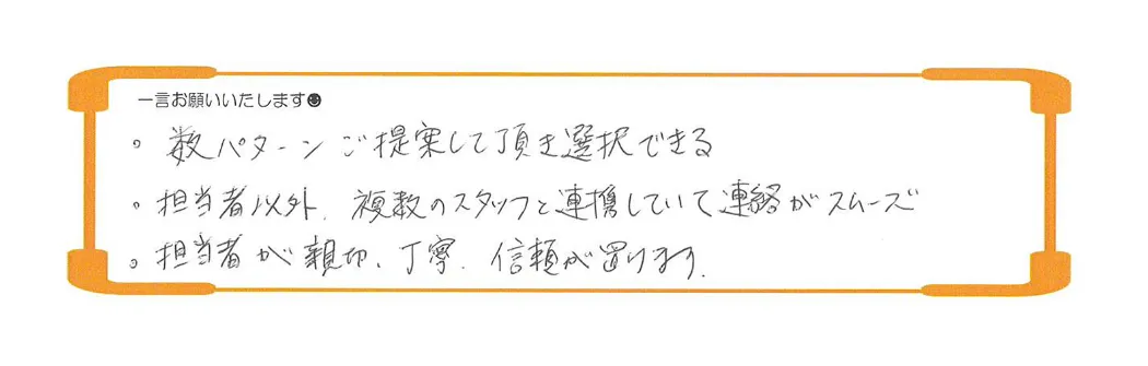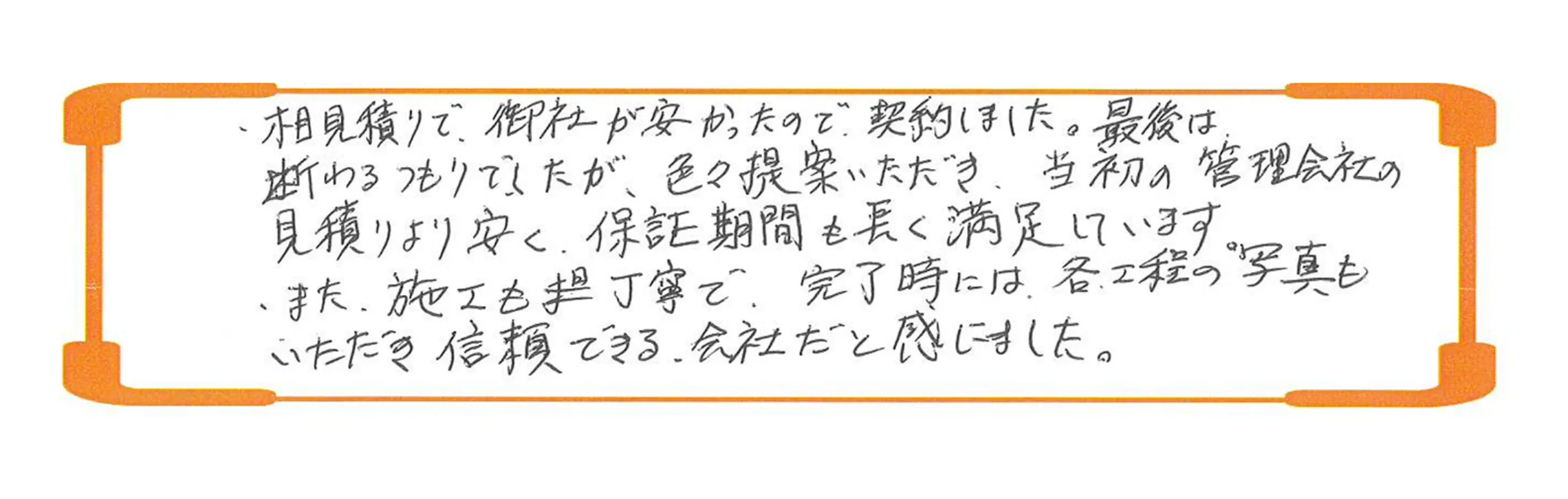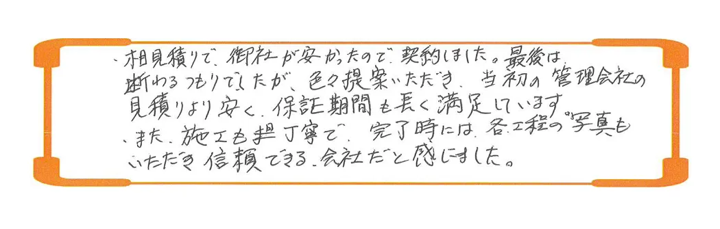 ・相見積りで、御社が安かったので契約しました。最後は断るつもりでしたが、色々提案いただき、当初の管理会社の見積りより安く、保証期間も長く満足しています。